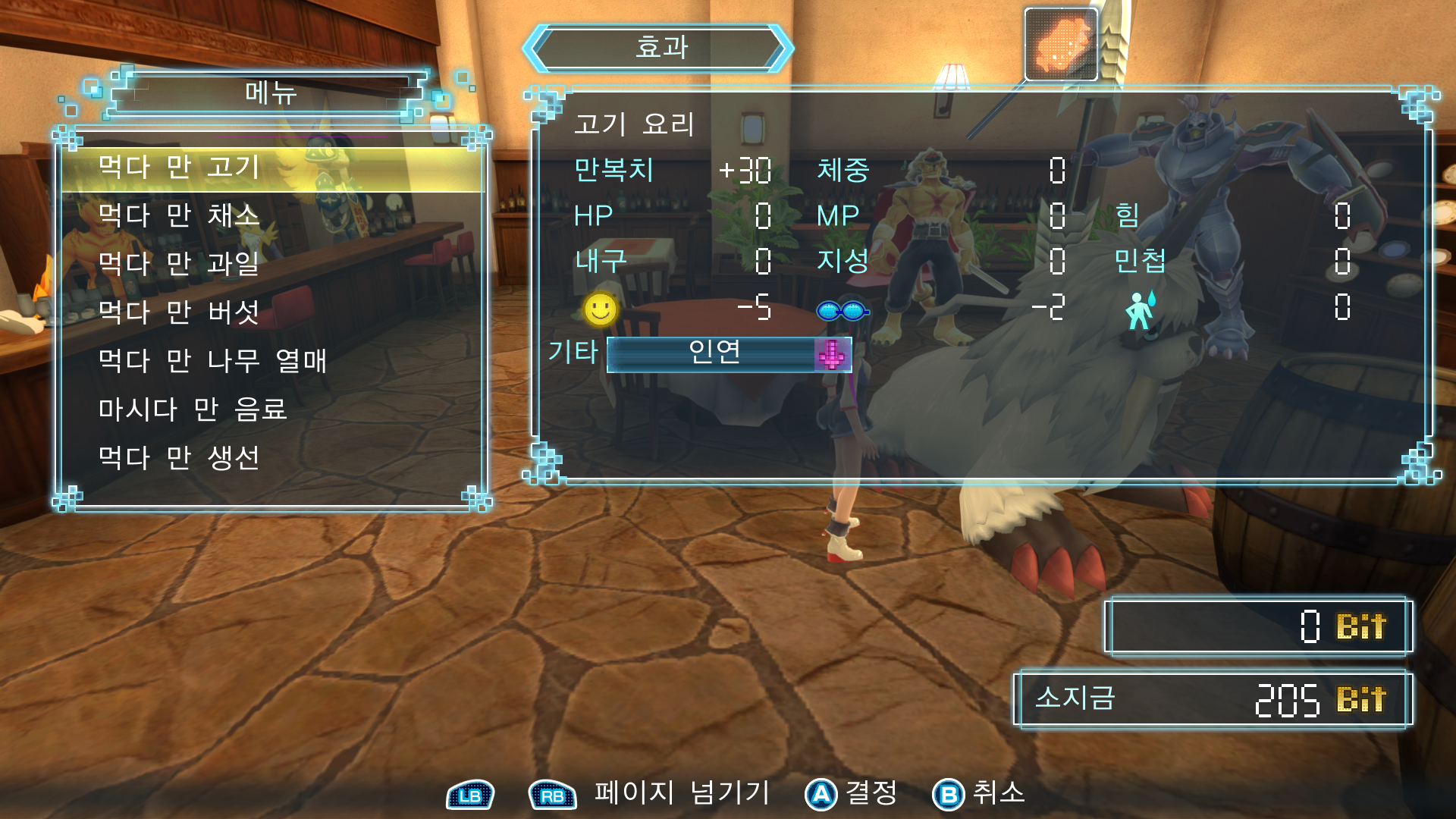 세라피몬은 상업 구역 - 레스토랑에서 음식을 판매합니다. 세라피몬이 판매하는 음식은 비싸지만 능력치를 많이 올려줍니다. 그리고 금요일에는 반값입니다.